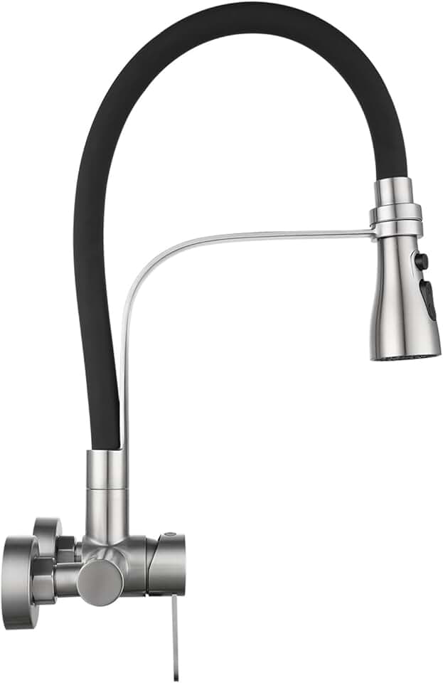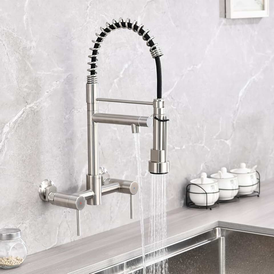 Dornberg Wall Mount Kitchen Faucet with Pull Down Sprayer, Commercial Kitchen Sink Faucet, Spring Faucet Double Handle 8 Inch Center Faucet for Kitchen Sink - Brushed Nickel