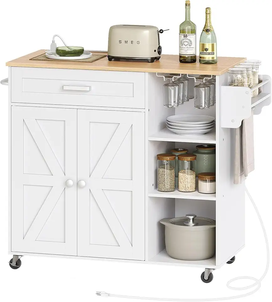 Kitchen Island Cart with Storage, Rolling Island Cart with Dual-Door Cabinet, Kitchen Island Table with 3 AC Outlets, with Spice Rack Mobile Kitchen Storage Islands, White and Natural MZD02UWN
