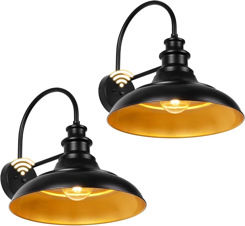 Dusk to Dawn Sensor Outdoor Barn Light Fixtures, 16 Inch Dome Farmhouse Outdoor Wall Sconces, Rustic Gooseneck Exterior Wall Mount Lights, Industrial Black Gold Wall Lanterns for Porch, 2 Pack