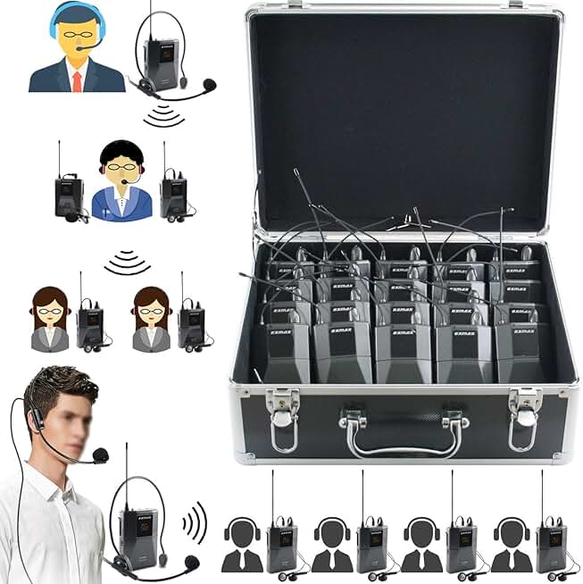 EXMAX EX-938 Wireless Headset Microphone Audio Tour Guide System for Church Translation Teaching Travel Simultaneous Interpretation.(1 Transmitter 20 Receivers with Black Aluninum Storage Case)
