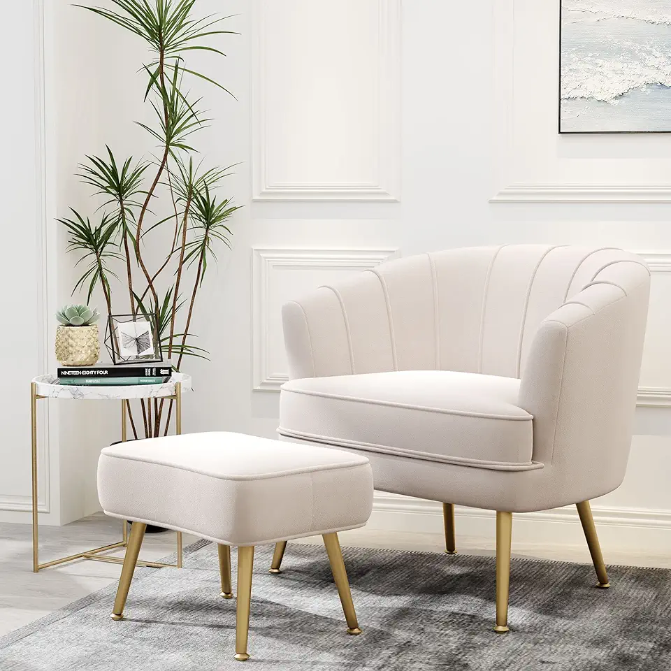 Andeworld Velvet Accent Chair with Ottoman, Upholstered Modern Single Sofa Side Chair,Comfy Barrel Club Living Room Armchair with Golden Metal Legs for Bedroom Living Reading Room Office, Beige