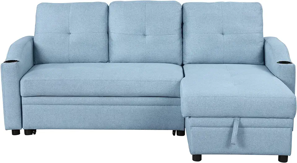 80 Inch L-Shaped Pull Out Sofa Bed Modern Padded Upholered Couch, Linen Fabric 3 Seater Sleeper with Storage Chaise and Cup Holder for Home, Living Room, Ofiice, Department, 80inch, Blue