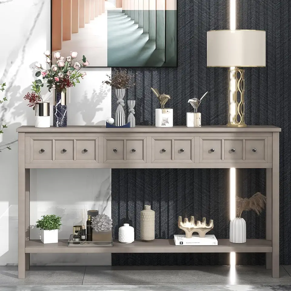 Rustic Console Table, 60in W x 34in H x 11in D, Gray Wash, 2 Drawers, Solid Wood, Multi-Function - Entryway, Living Room, Bedroom Table