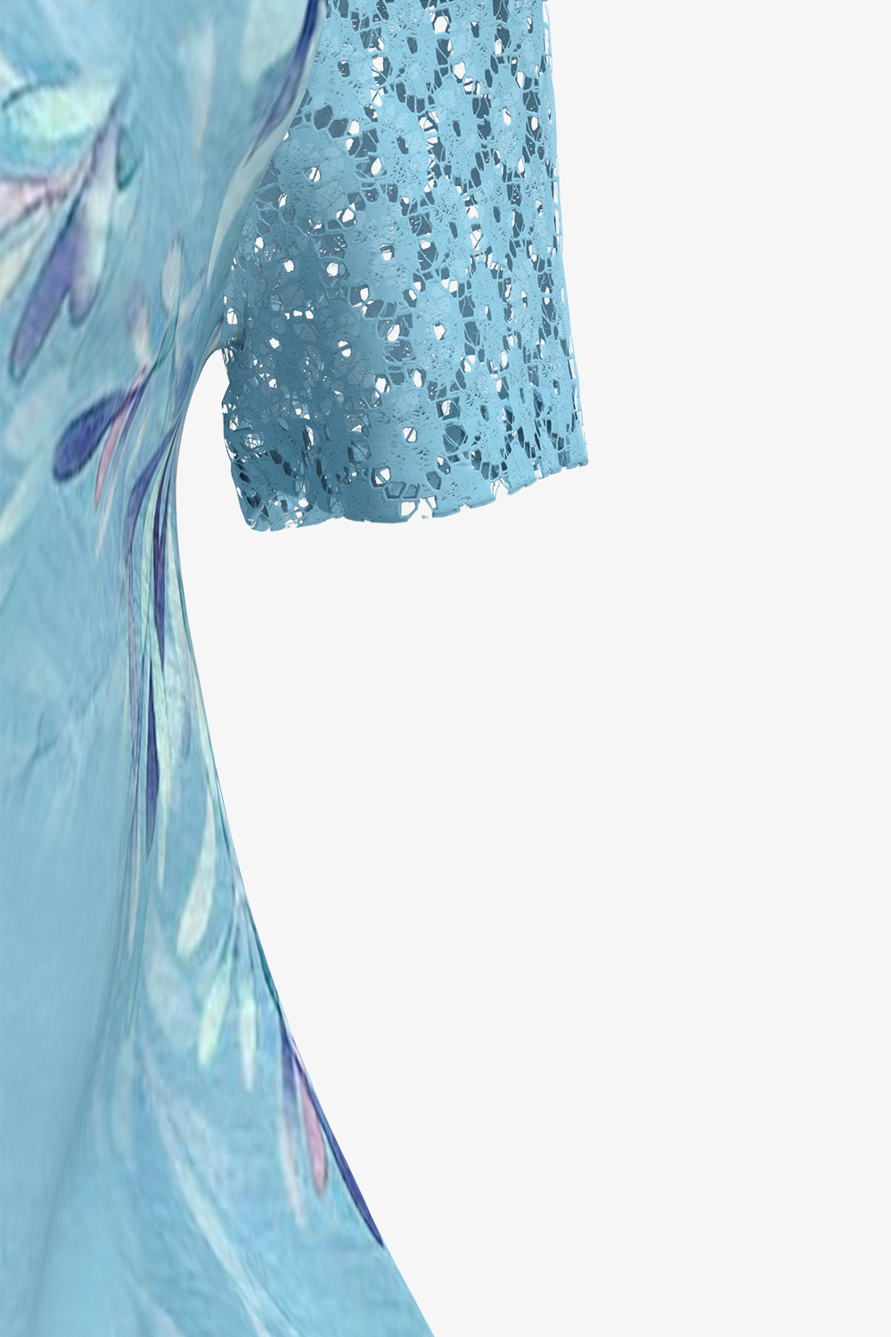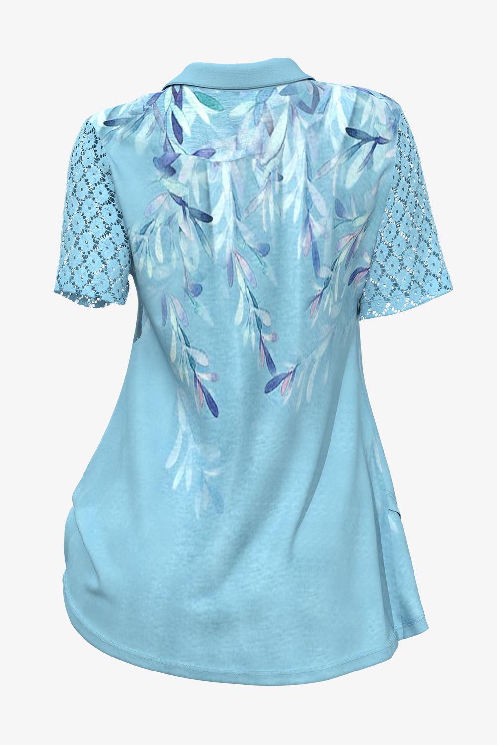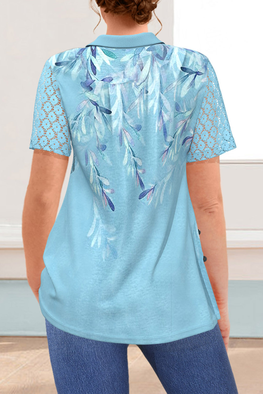Flycurvy Plus Size Casual Blue Lace Plant Print Asymmetrical Hem Decorative Button Blouse