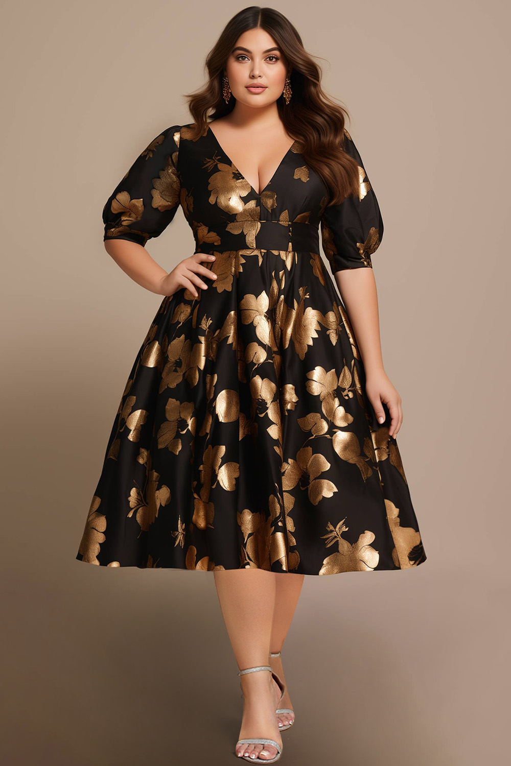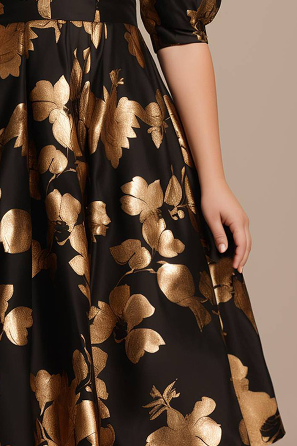 Flycurvy Plus Size Cocktail Gold Floral Print Puff Sleeve Empire Waist Tea-Length Dress