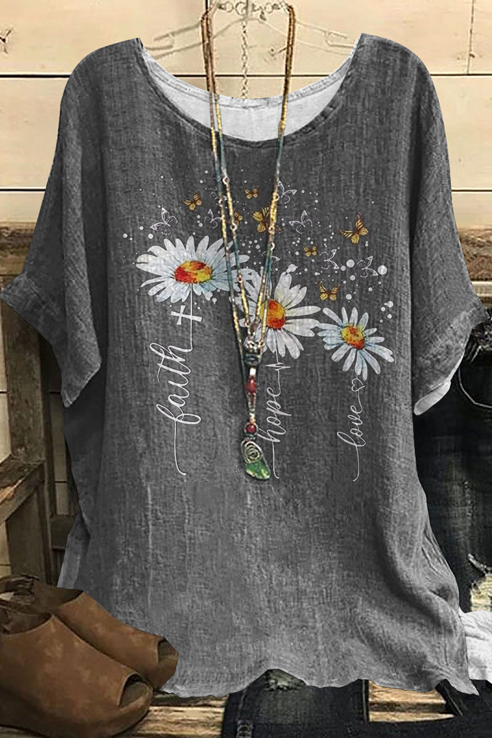 Flycurvy Plus Size Casual Dark Grey Floral Print Round Neck Linen Blouse