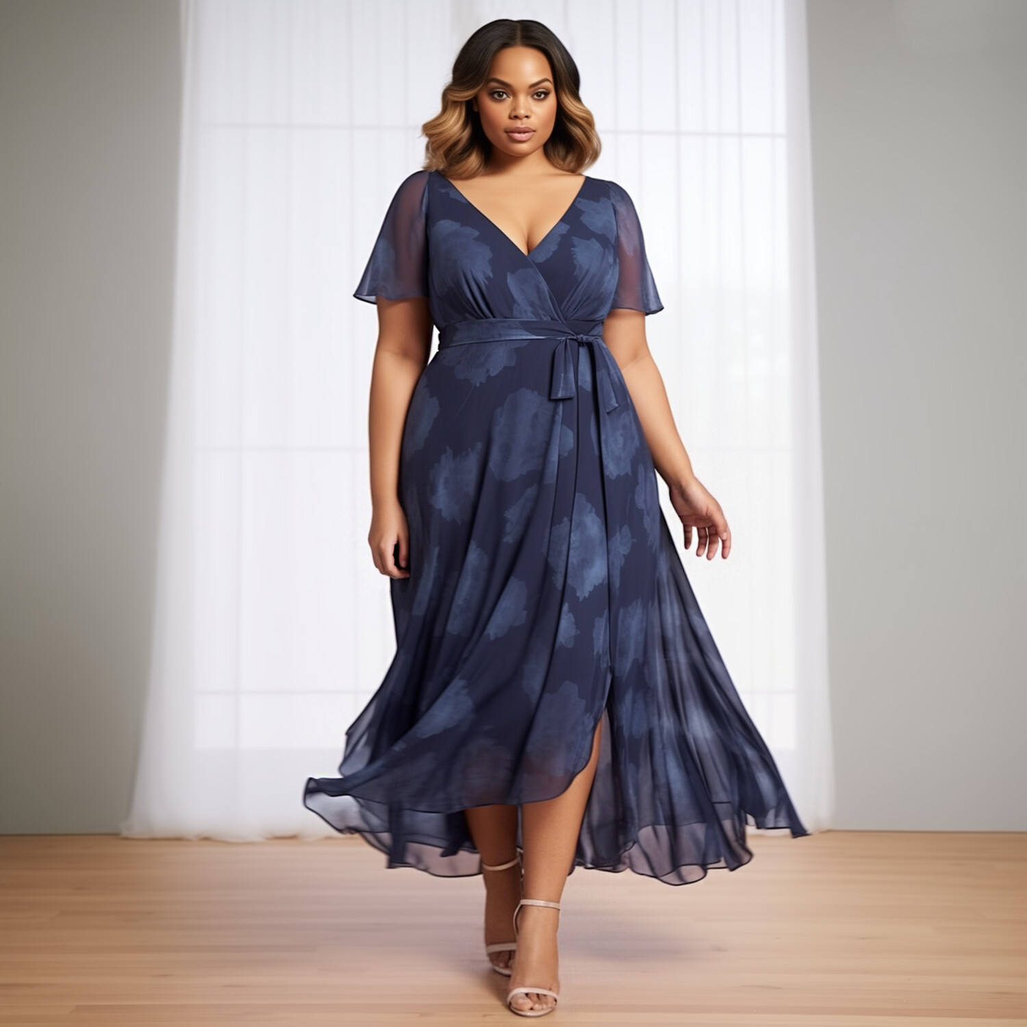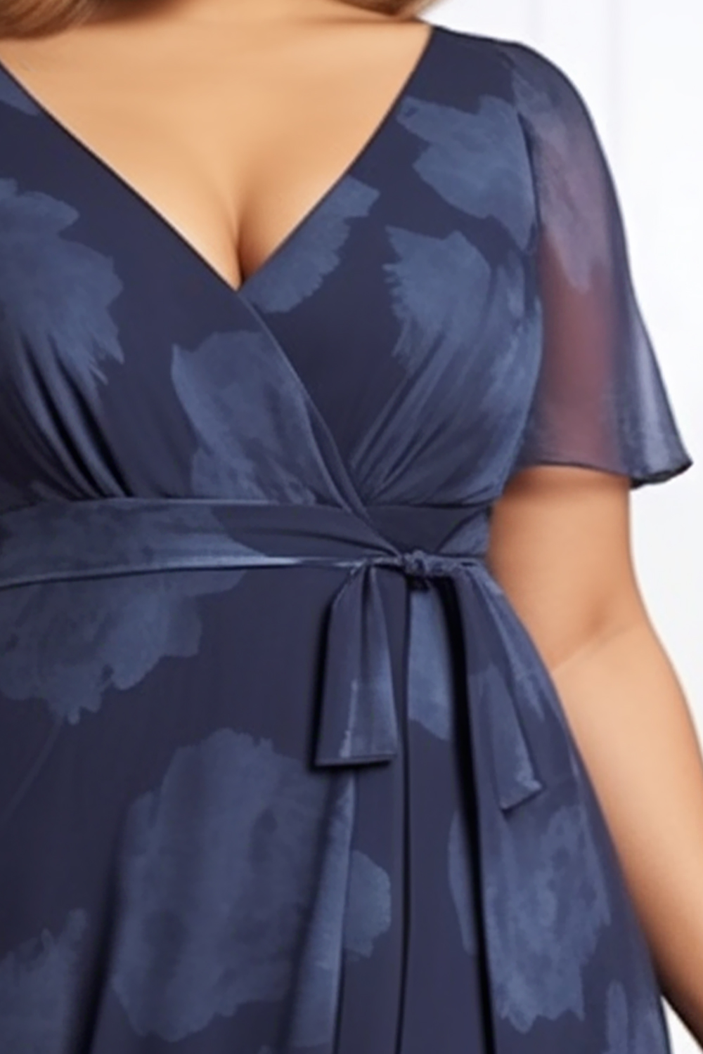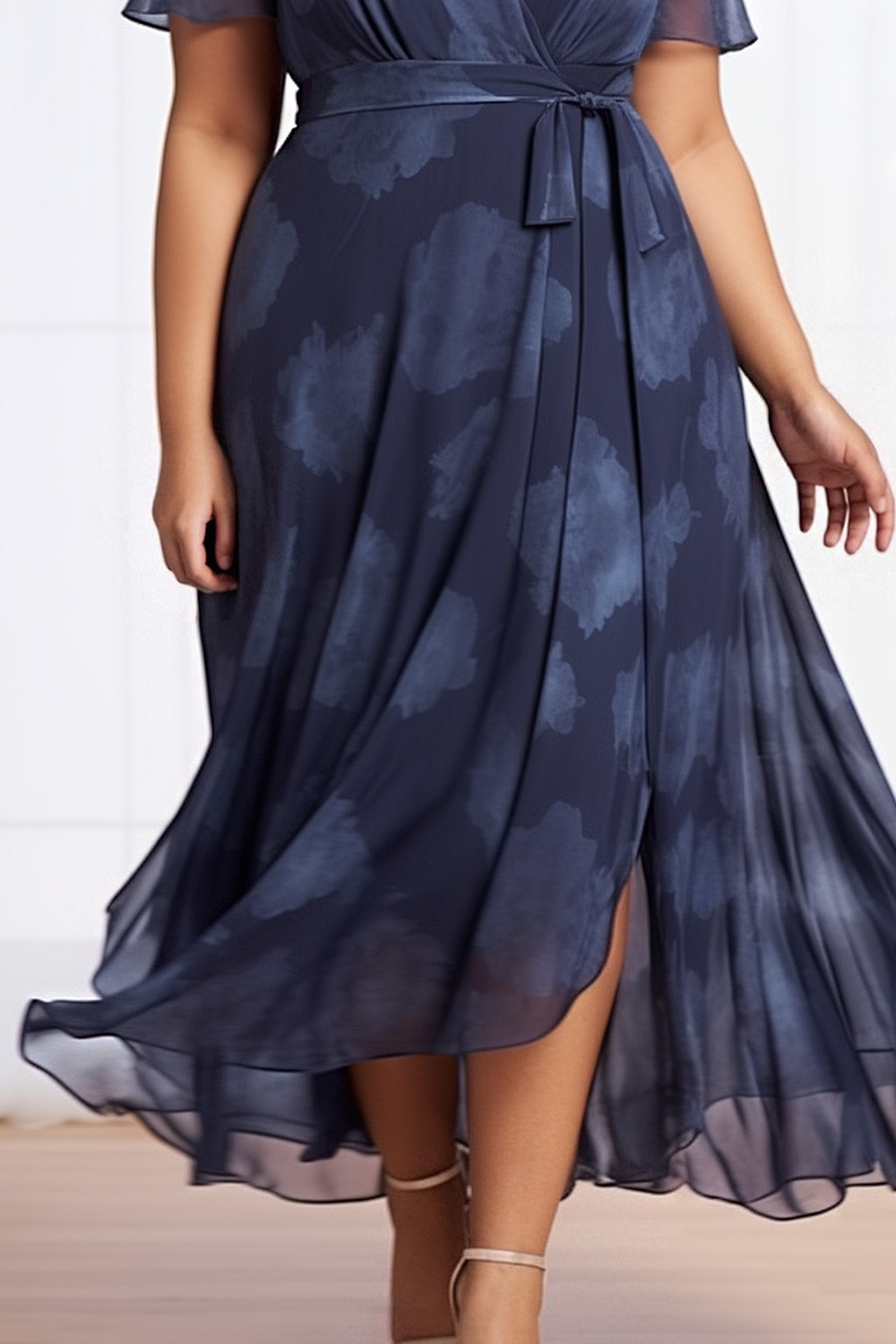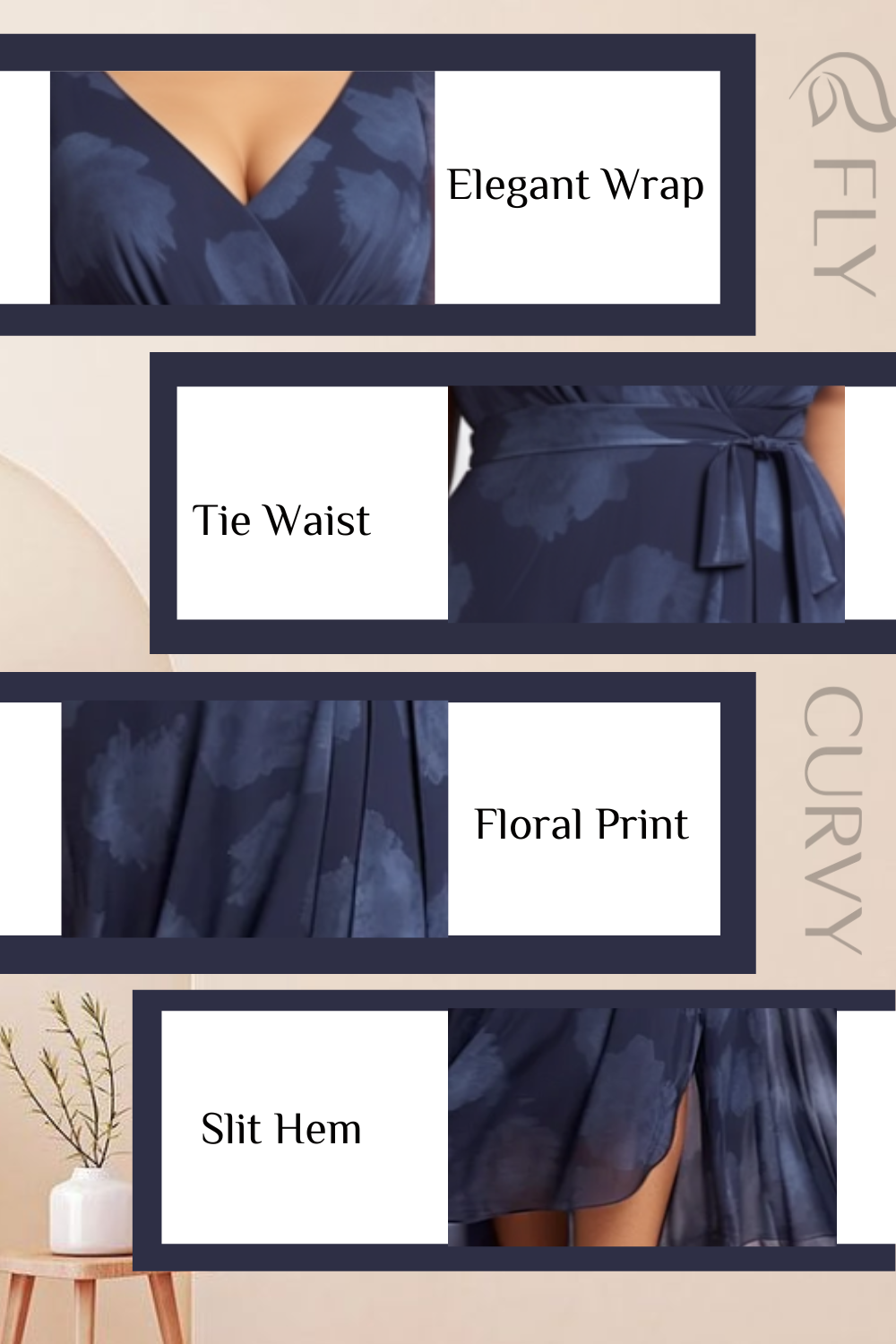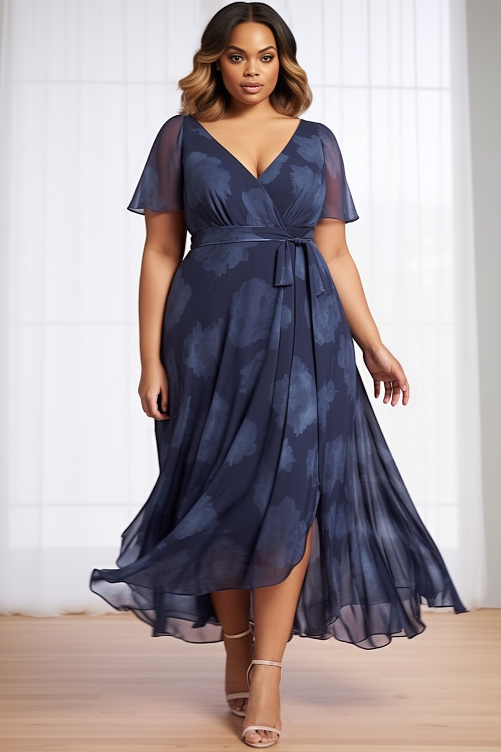 Flycurvy Plus Size Mother Of The Bride Navy Blue Chiffon Floral Print Wrap Maxi Dress