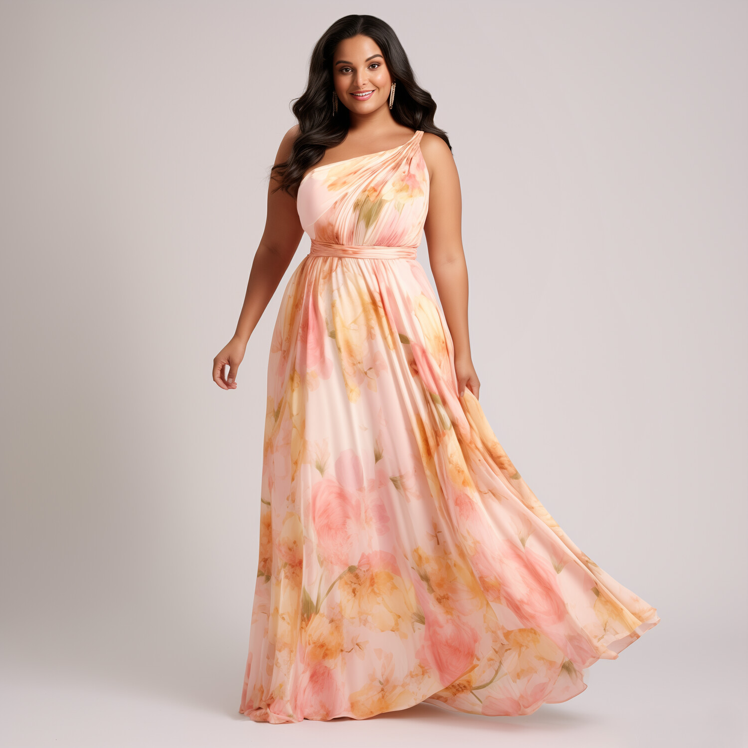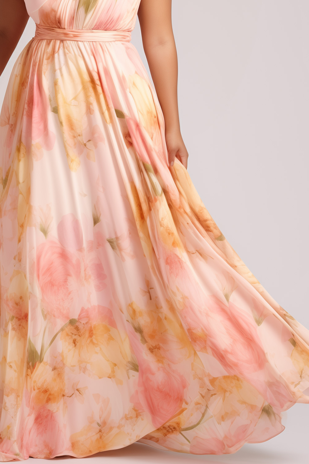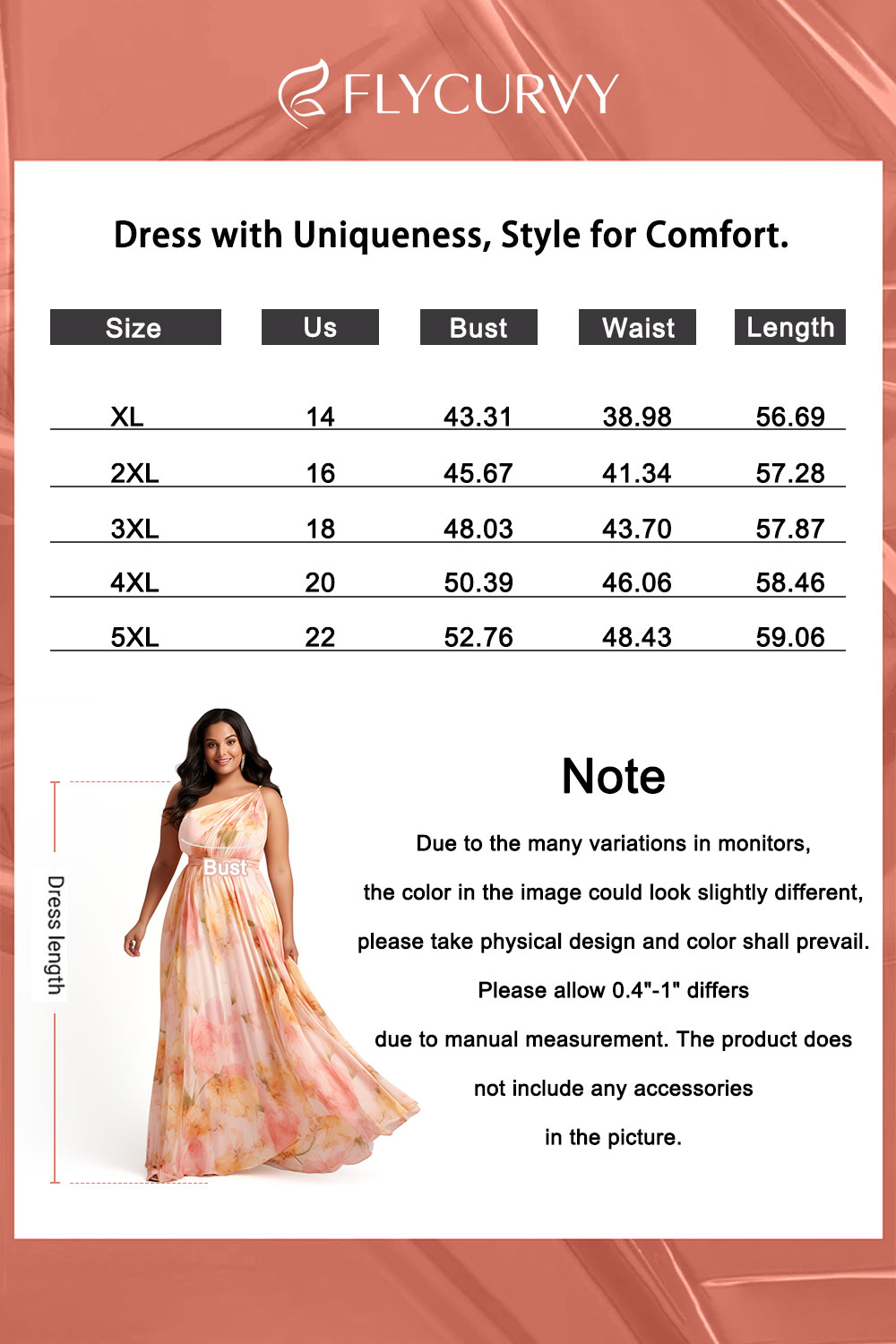 Flycurvy Plus Size Wedding Guest Pink Chiffon Floral Print One Shoulder Maxi Dress