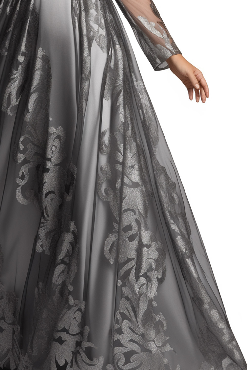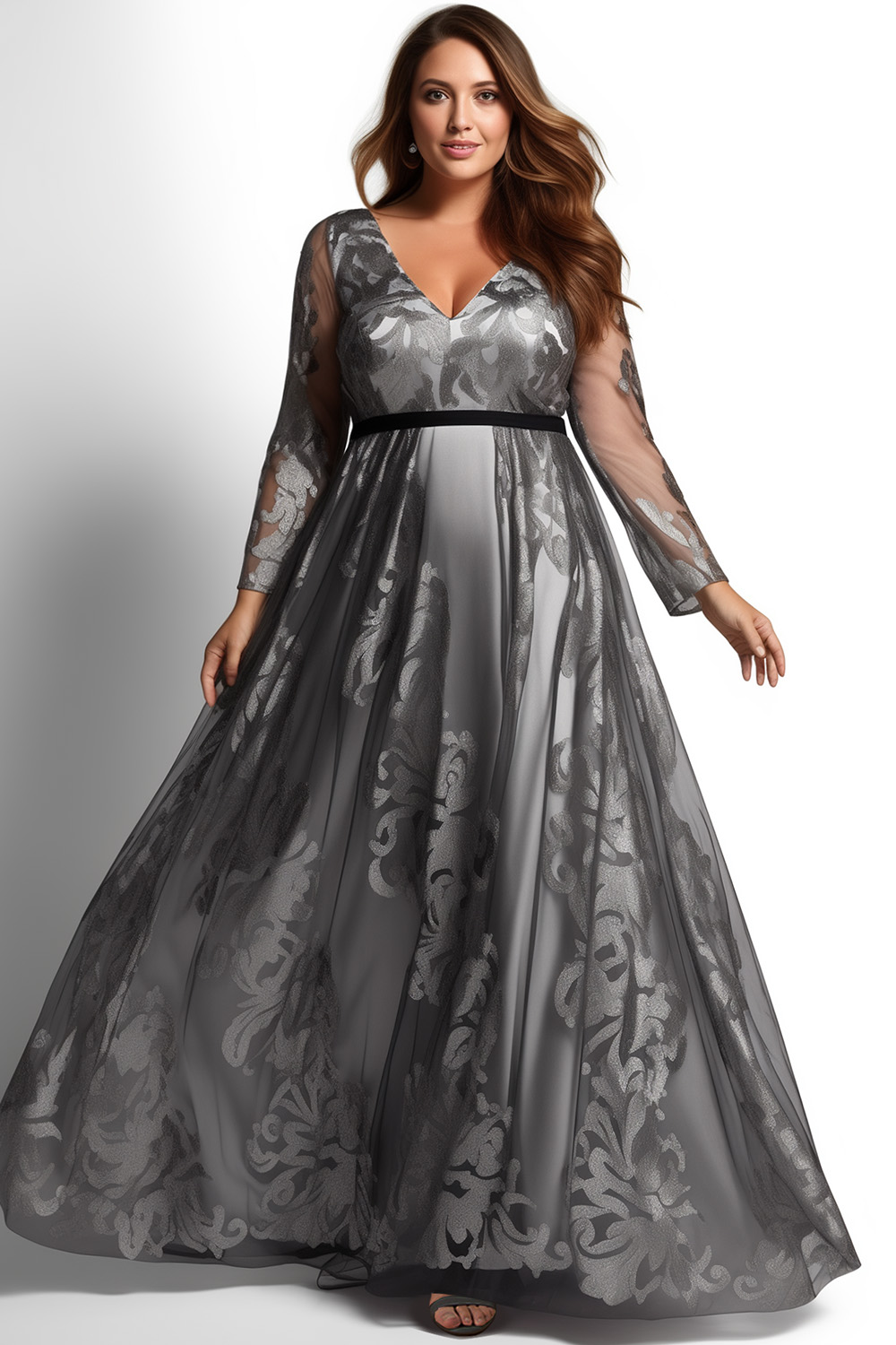 Flycurvy Plus Size Wedding Guest Dark Gray Lace Long Sleeve Maxi Dress