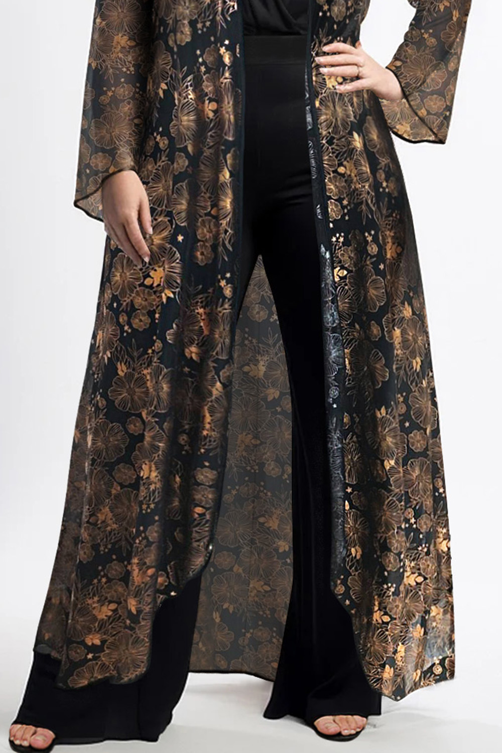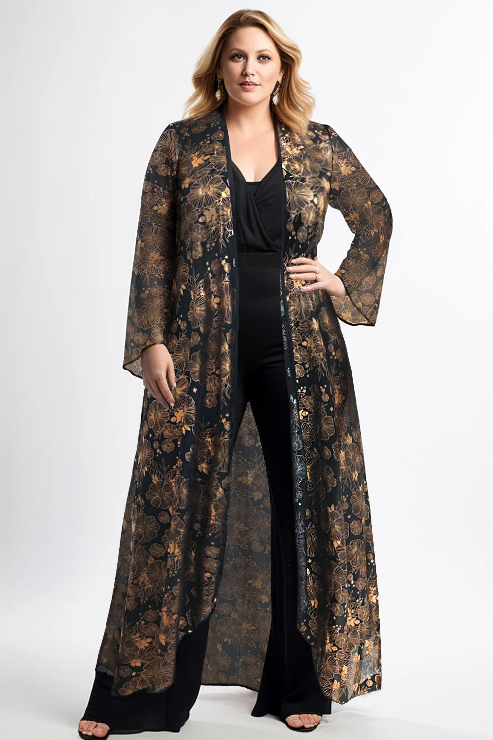 Flycurvy Plus Size Wedding Guest Black Mesh Empire Waist Printed Two Pieces Jumpsuit With Jacket