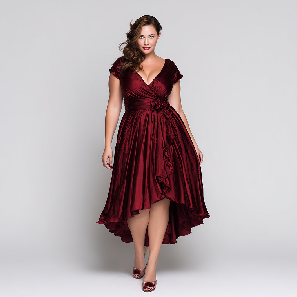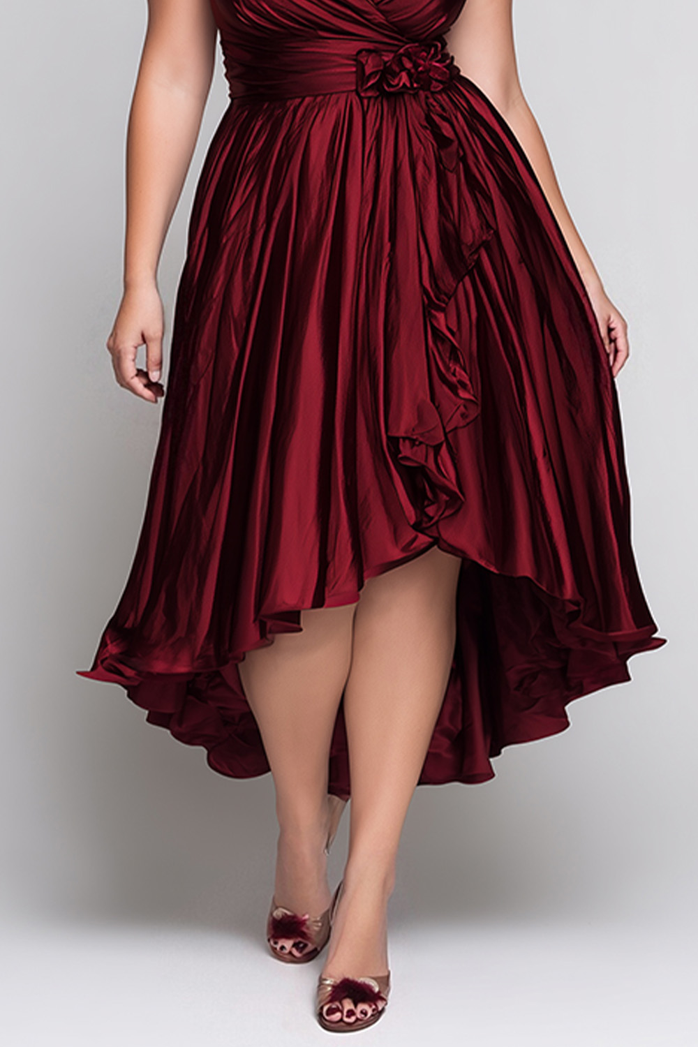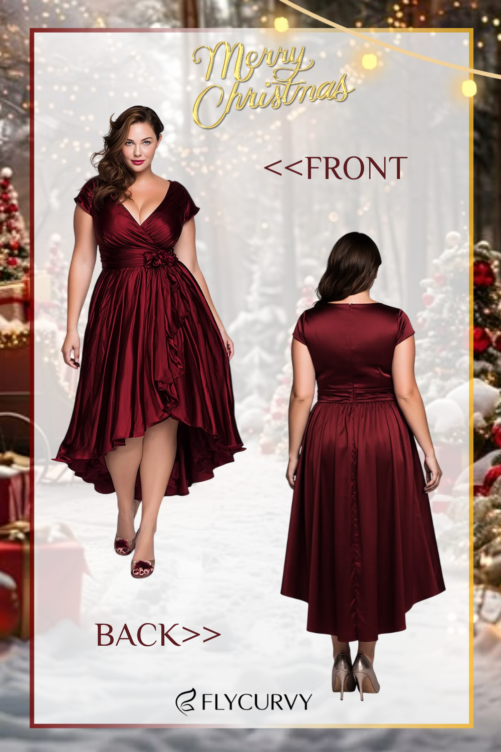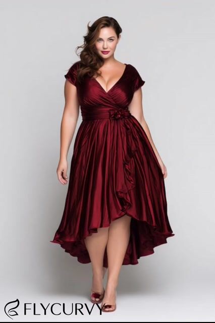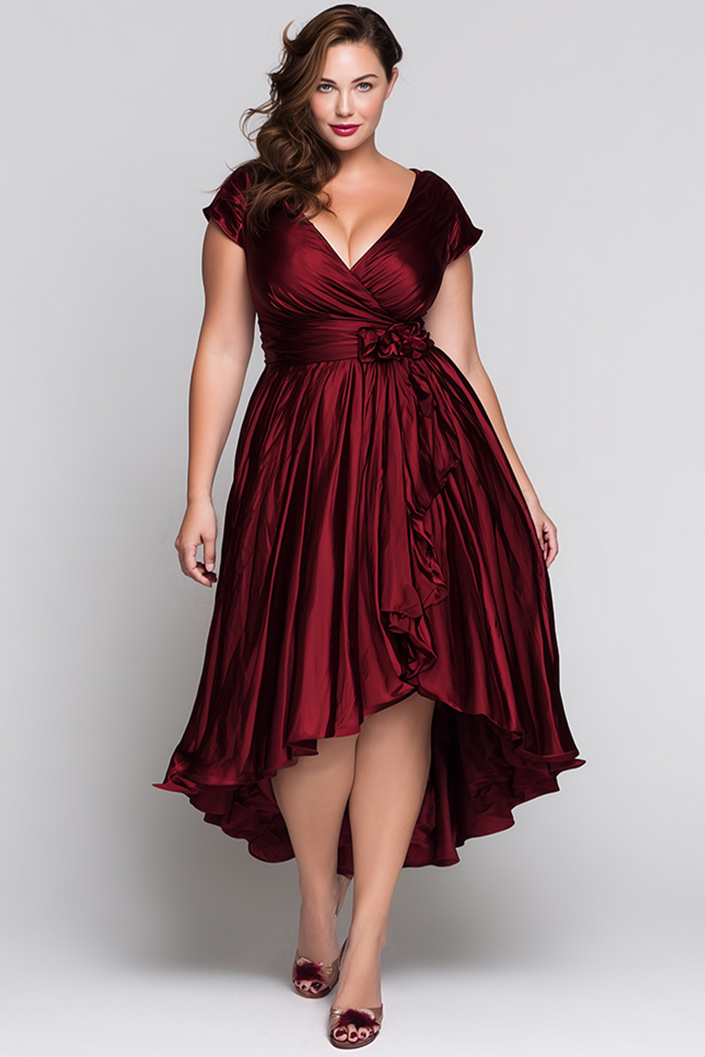 Flycurvy Plus Size Mother Of The Bride Burgundy Satin Wrap High Low Hem Midi Dress
