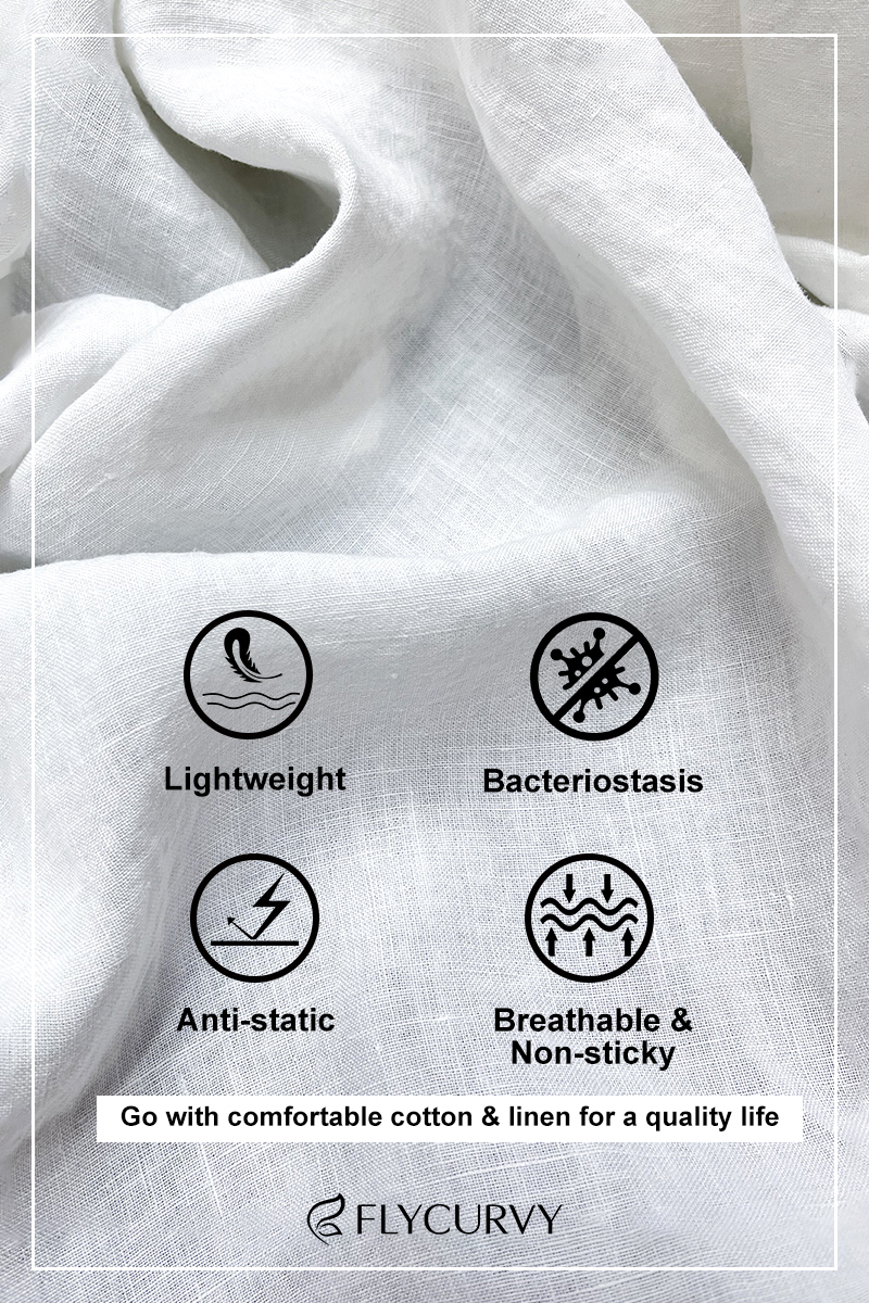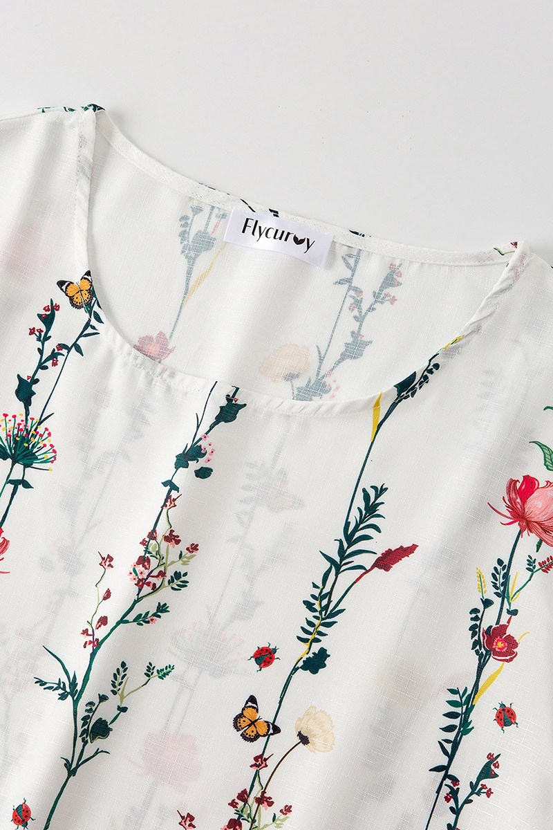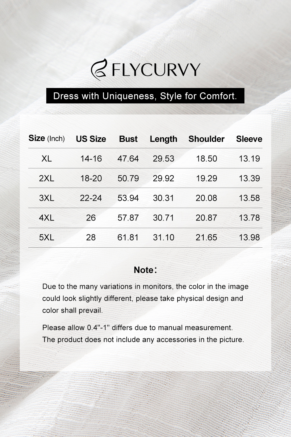 Flycurvy Plus Size Casual White Linen Round Neck Floral Print Half Sleeve Loose Blouse
