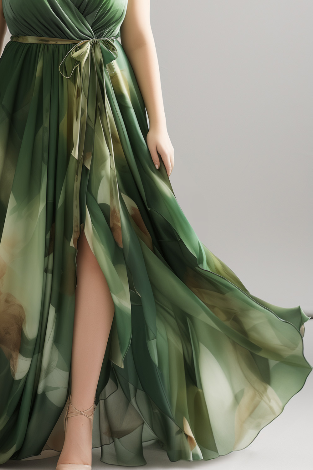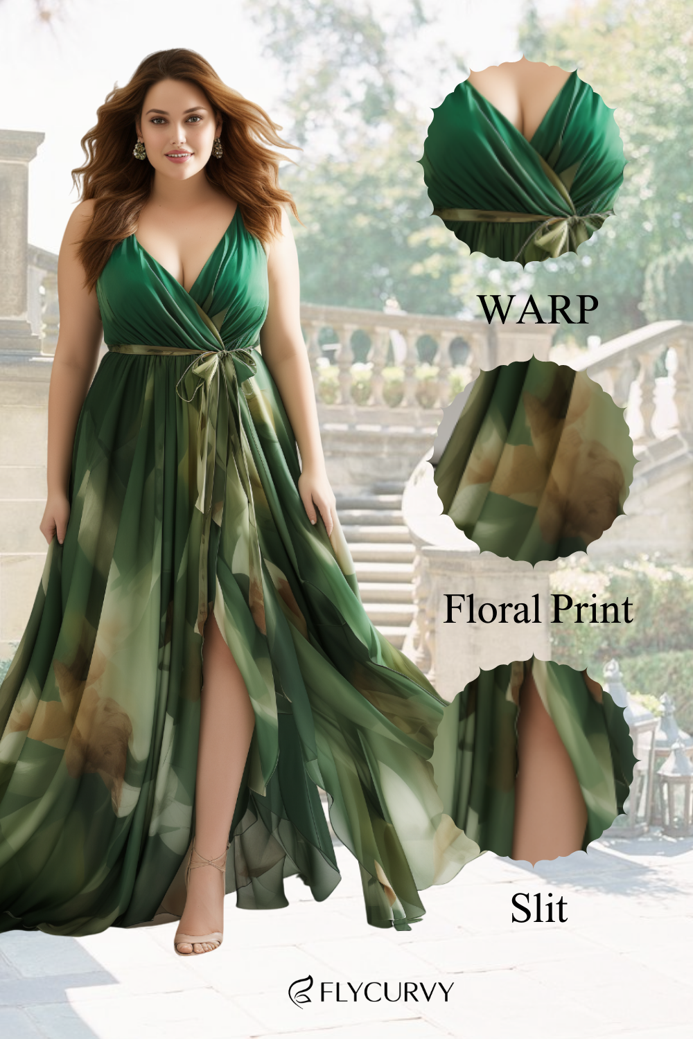 Flycurvy Plus Size Wedding Guest Green Chiffon Floral Print Wrap Slit Cami Maxi Dress