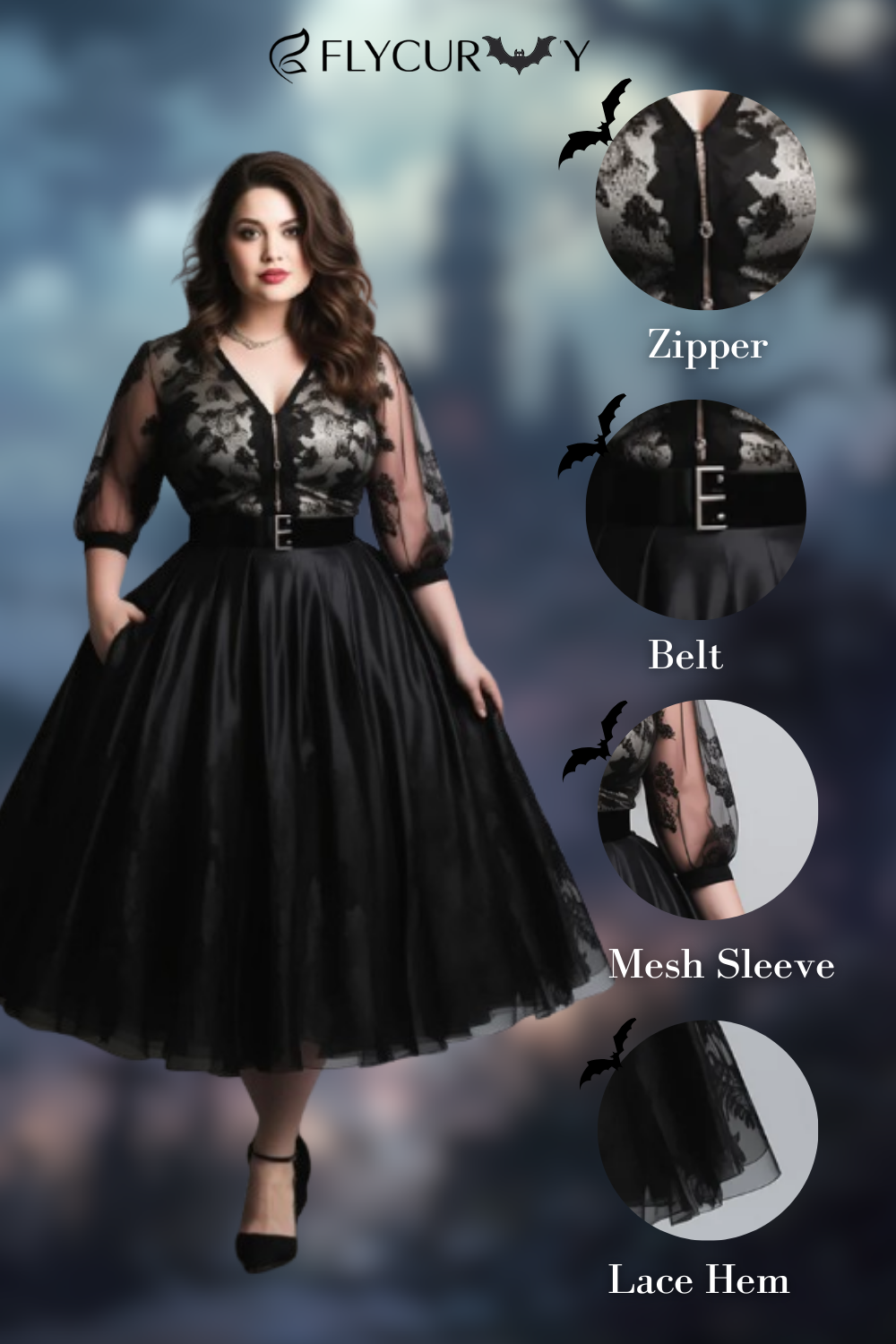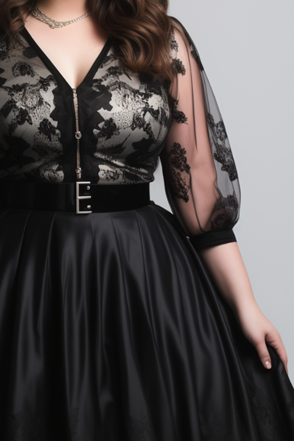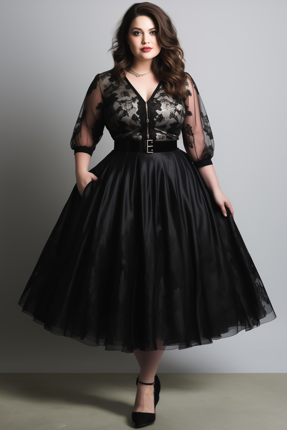 Flycurvy Plus Size Wedding Guest Black Lace Zipper 3/4 Puff Sleeve Belt Midi Dress