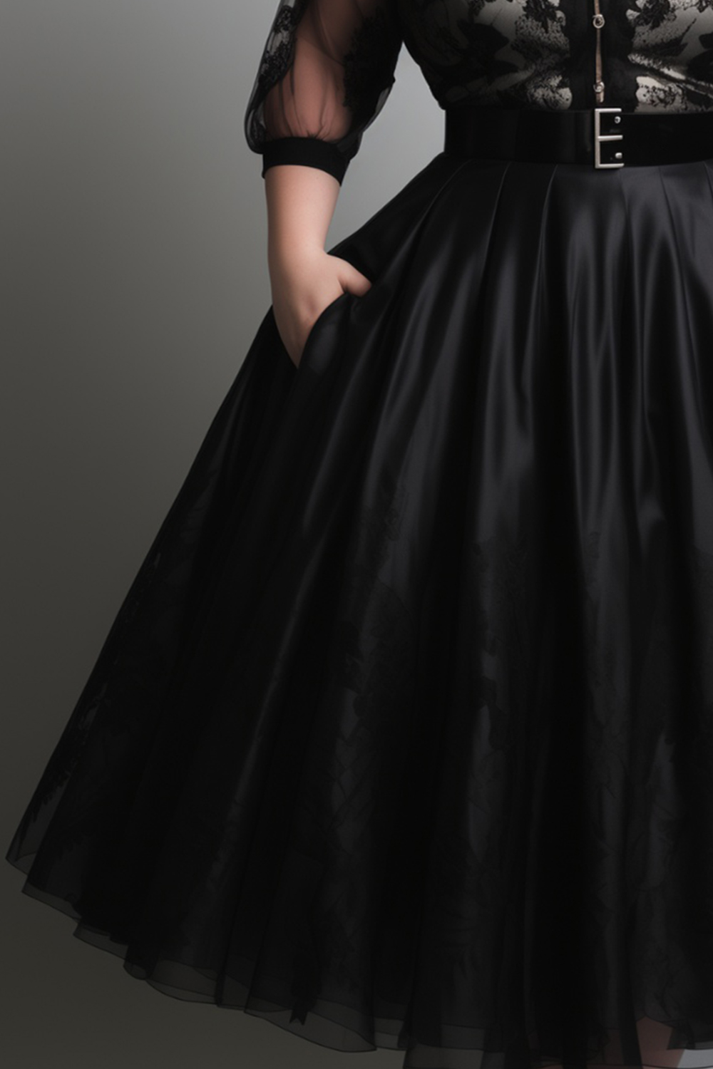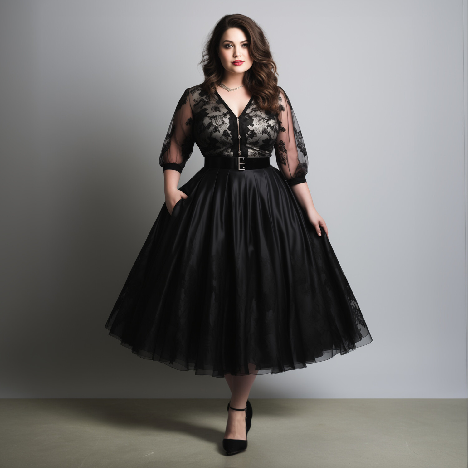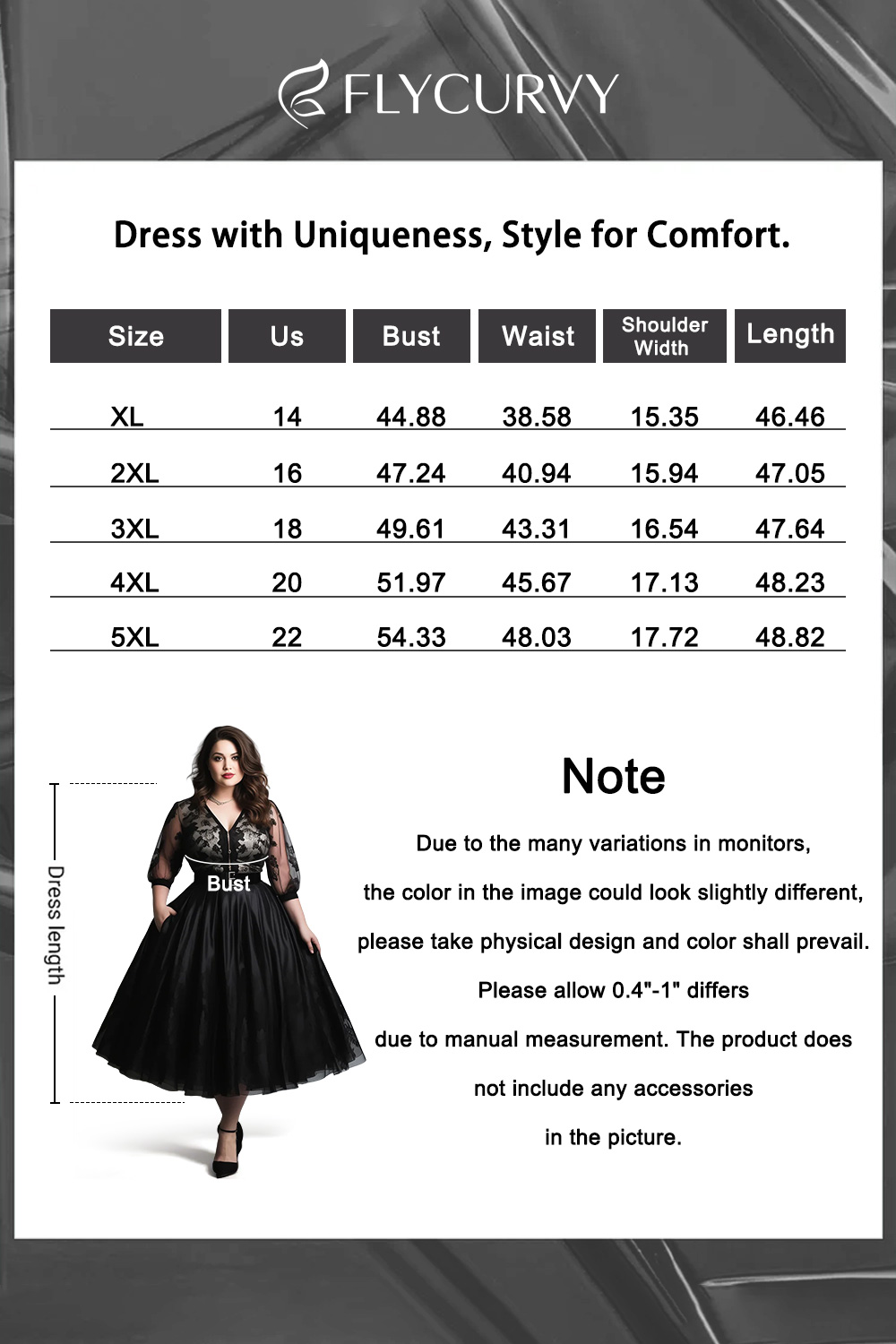 Flycurvy Plus Size Wedding Guest Black Lace Zipper 3/4 Puff Sleeve Belt Midi Dress