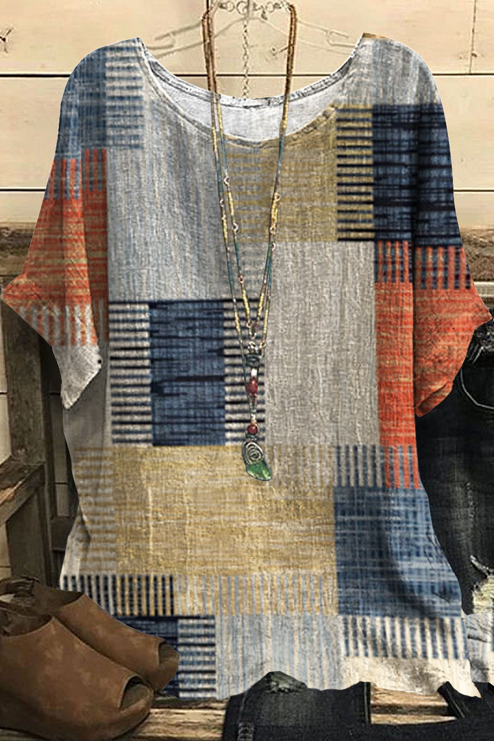 Flycurvy Plus Size Casual Plaid Colorblock Vintage Round Neck Linen Blouse