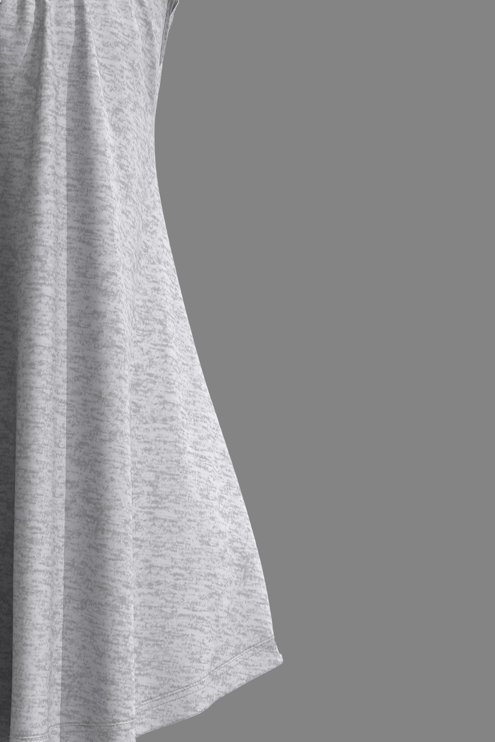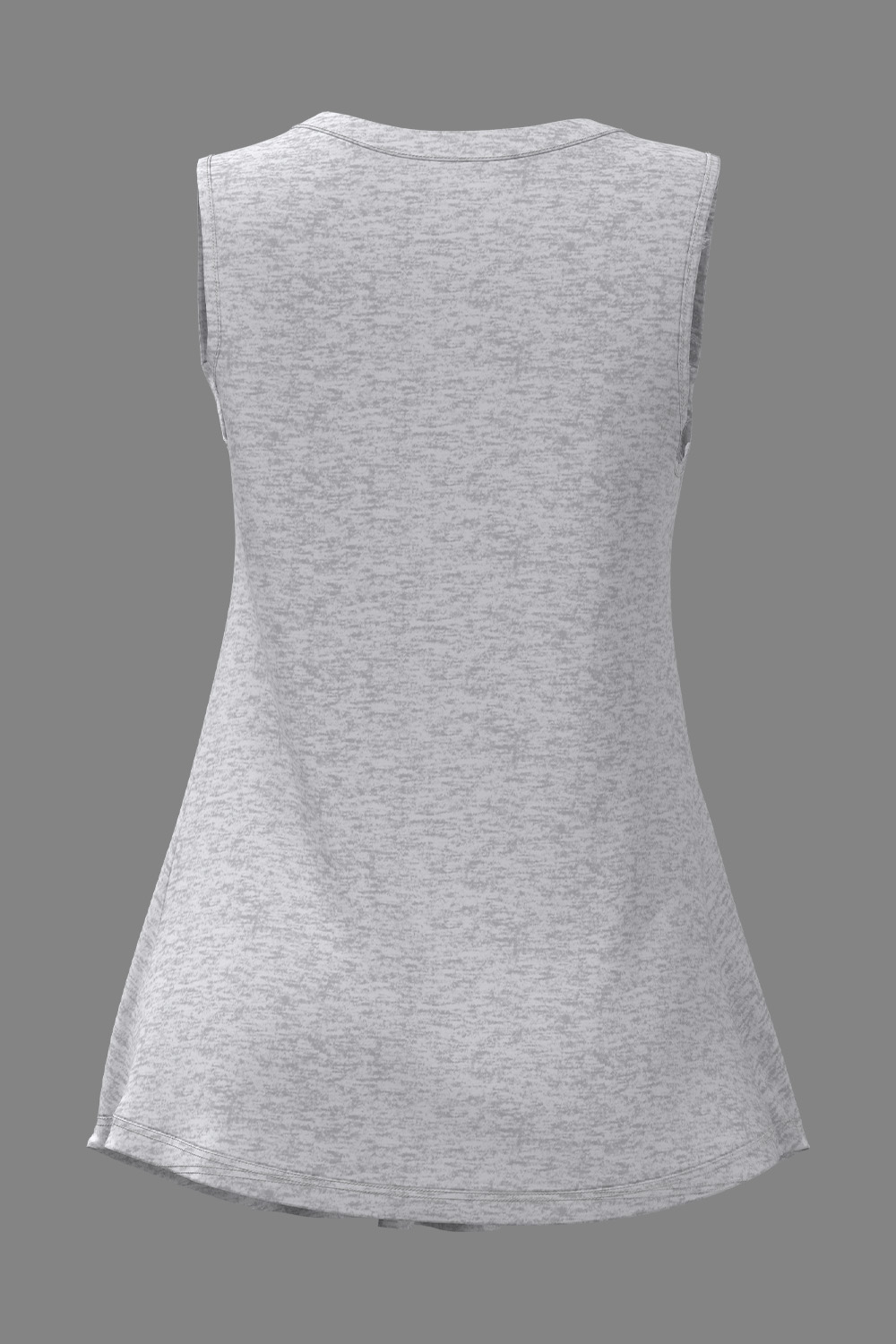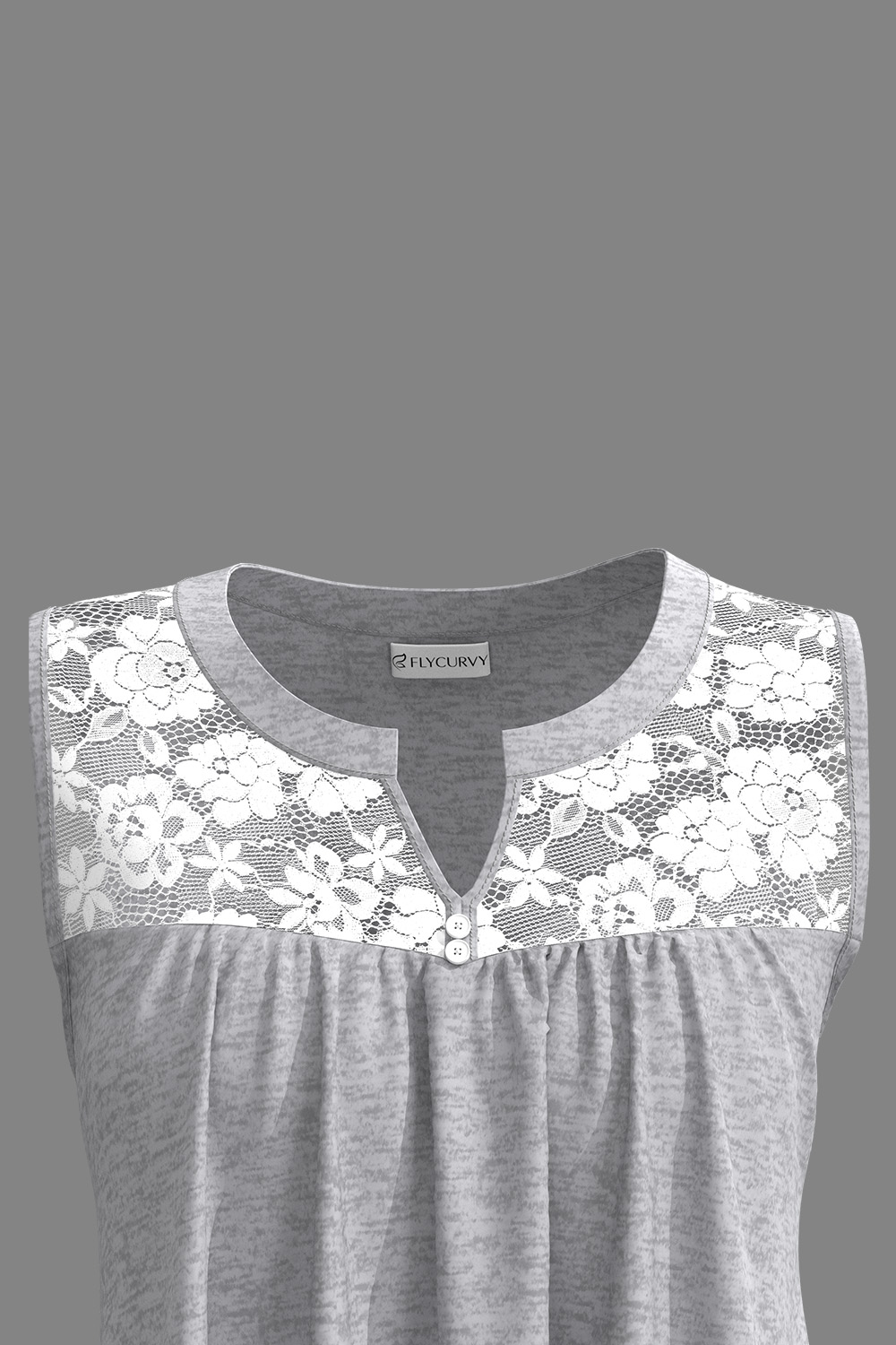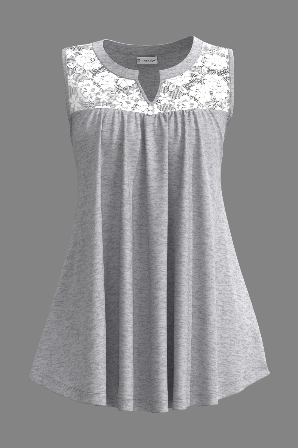 Flycurvy Plus Size Casual Grey Lace Stitching Decorative Button Fold Tank Top