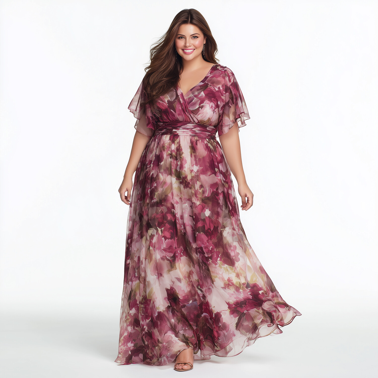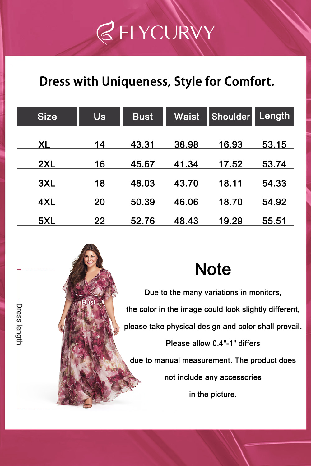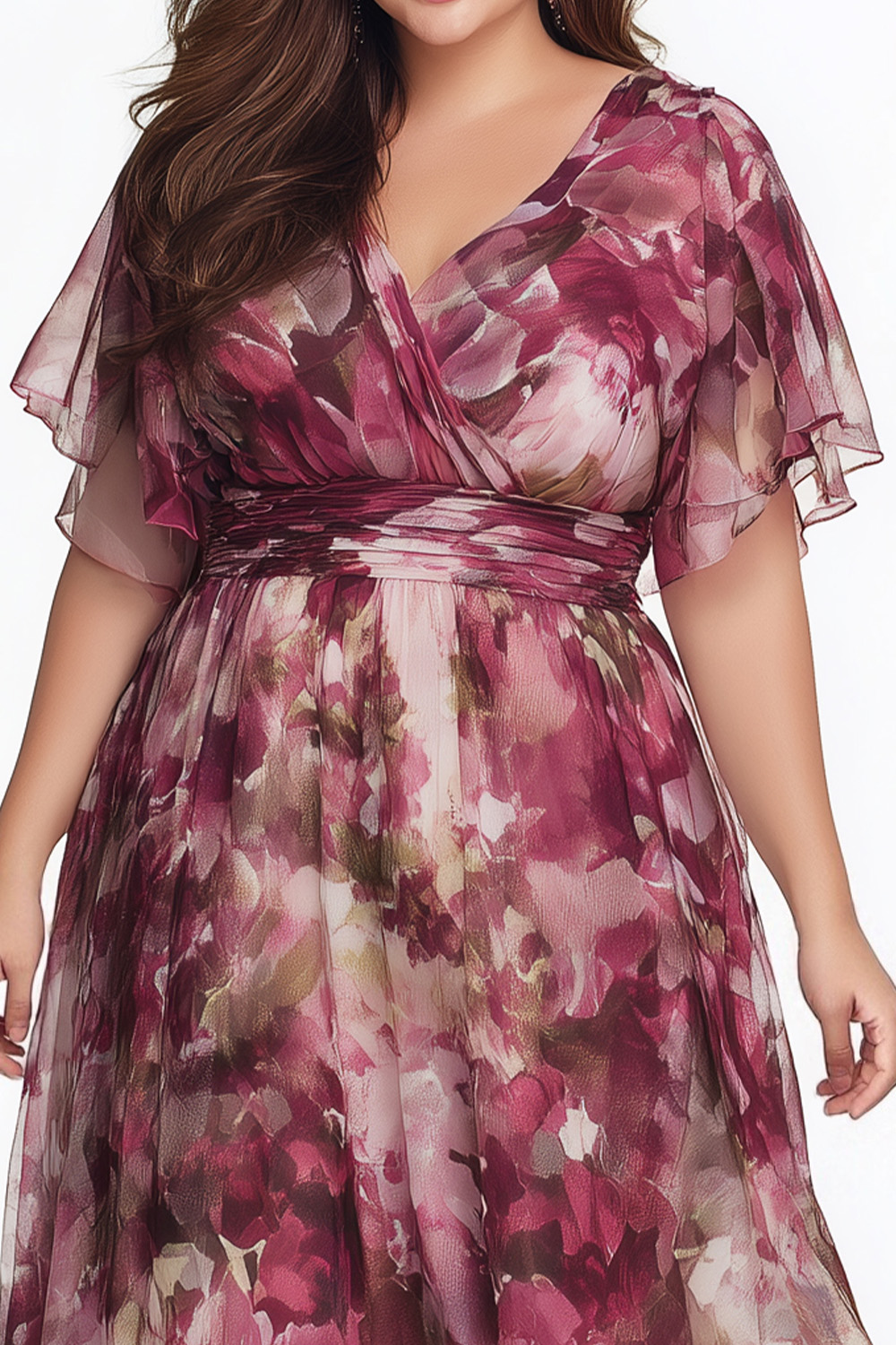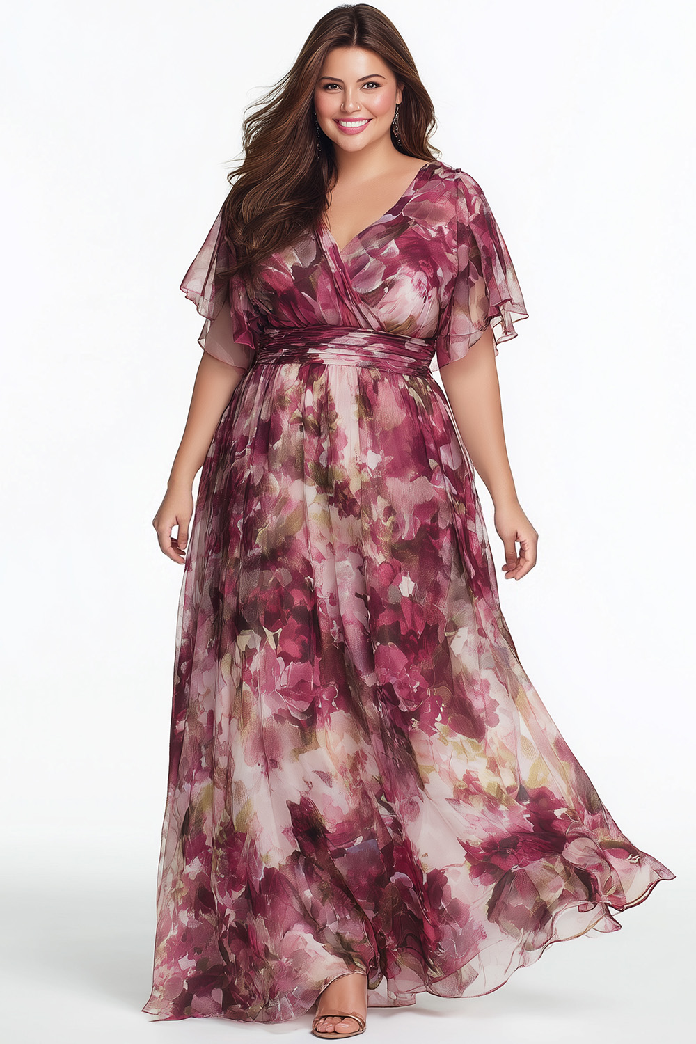 Flycurvy Plus Size Wedding Guest Fuchsia Organza Floral Print Wrap Flutter Sleeve Maxi Dress