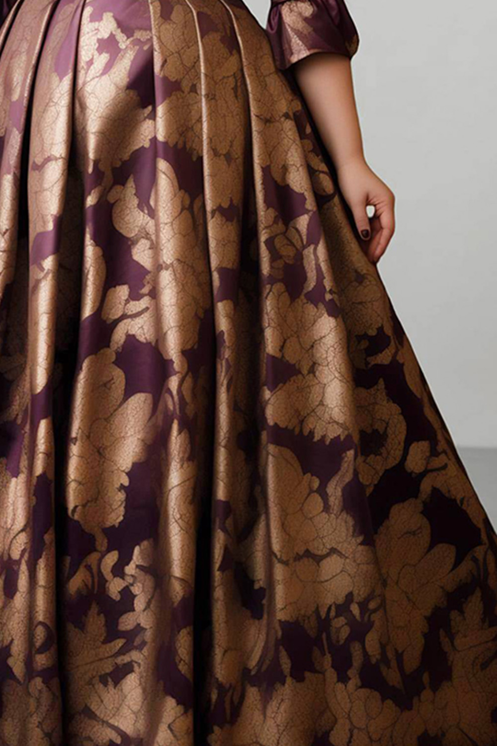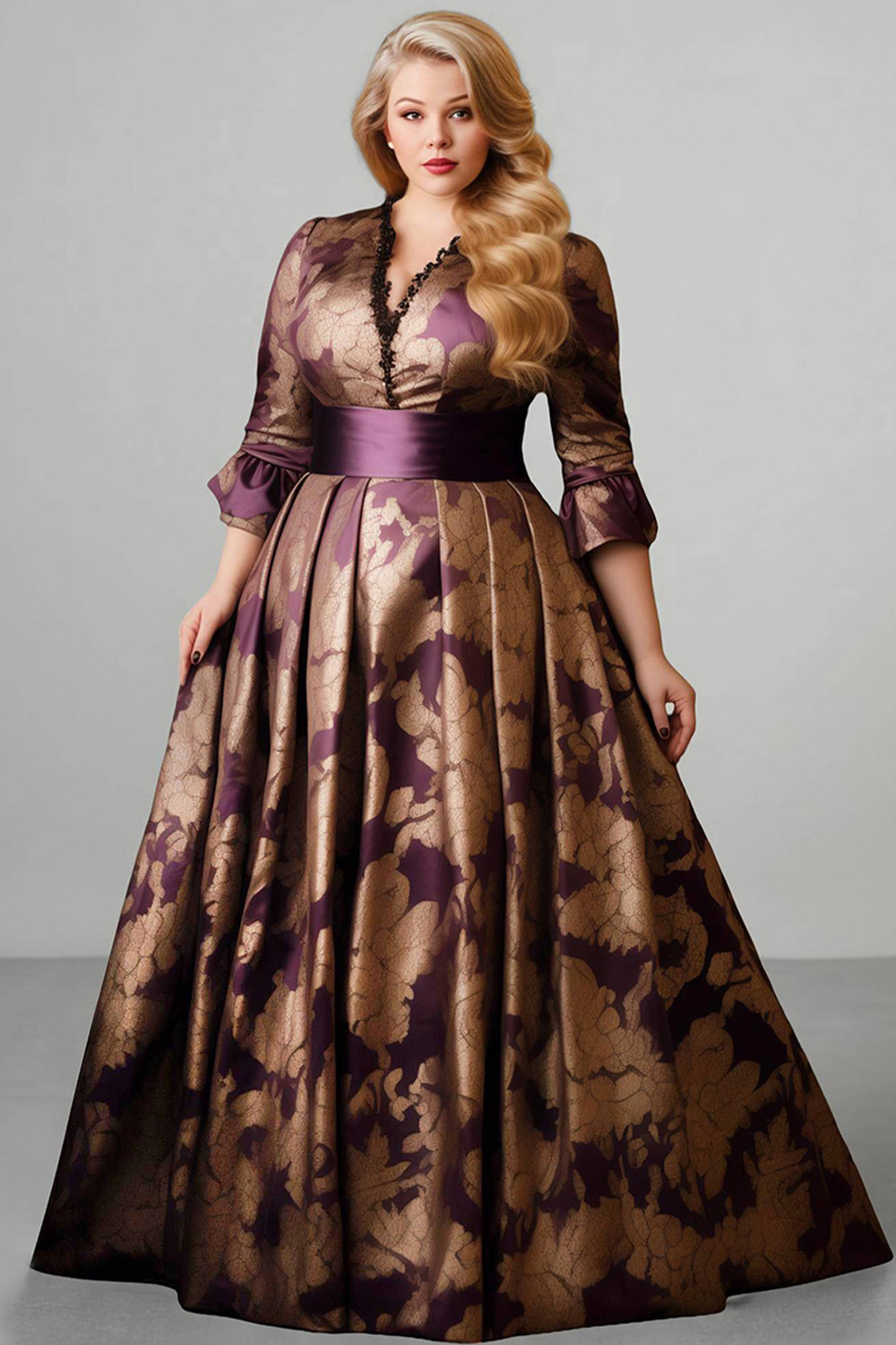 Flycurvy Plus Size Wedding Guest Purple Satin Floral Print Flare Sleeve Maxi Dress